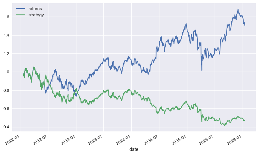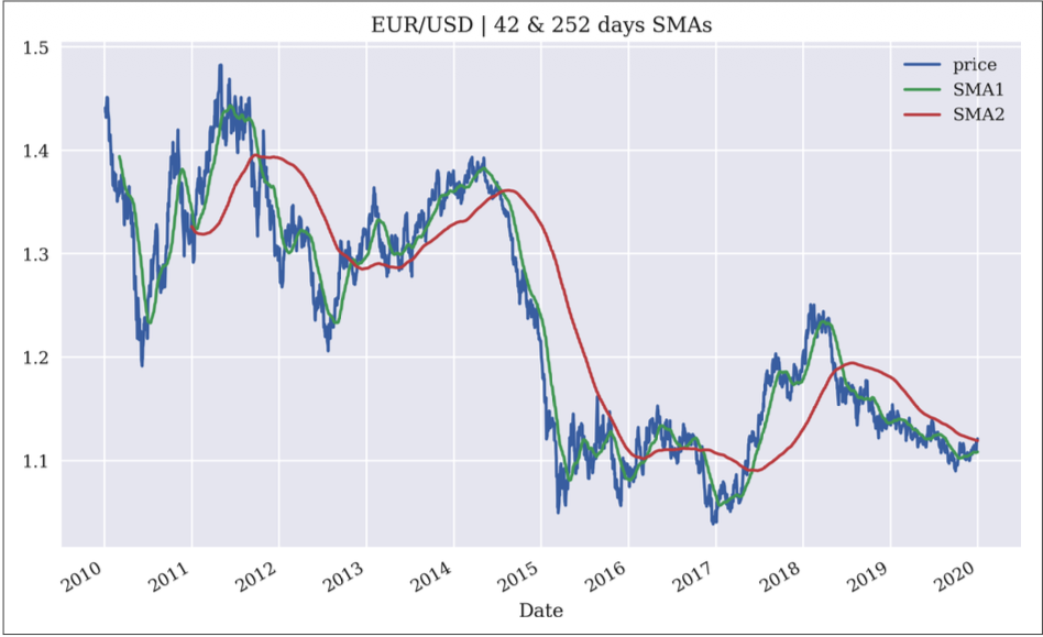 One of the SMA (simple moving average) strategies proposed in the Hilpisch book goes like this: we construct 2 SMA indicators, one short (42 days) and one long (252 days), and whenever the short indicator is above the long indicator (indicative that recent tide is bullish), we take a long position, and whenever the long indicator is above the short indicator (the reverse), we take a short position.