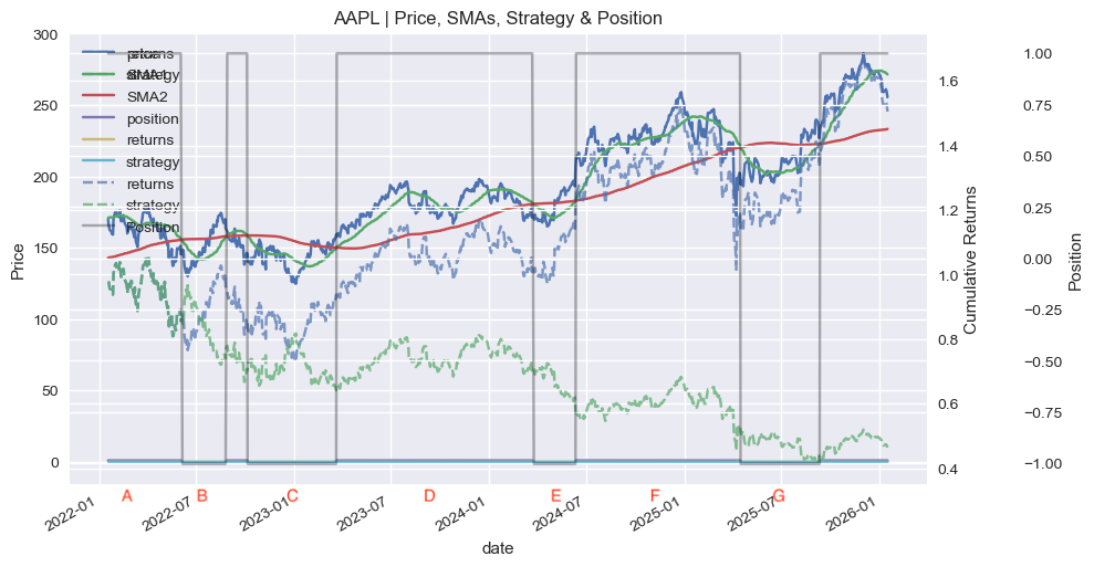 On the top section of the graph, you see the price, SMA1 and SMA2 lines. Below, the dotted blue and green lines show the cumulative returns of the stock and strategy respectively. The grey line depicts long and short positions based on calculations according to our rule. Various regions are labeled A to G.