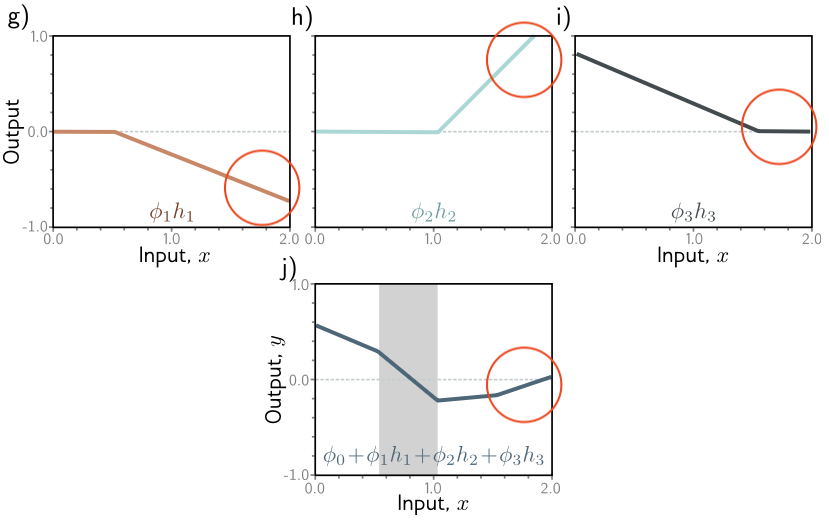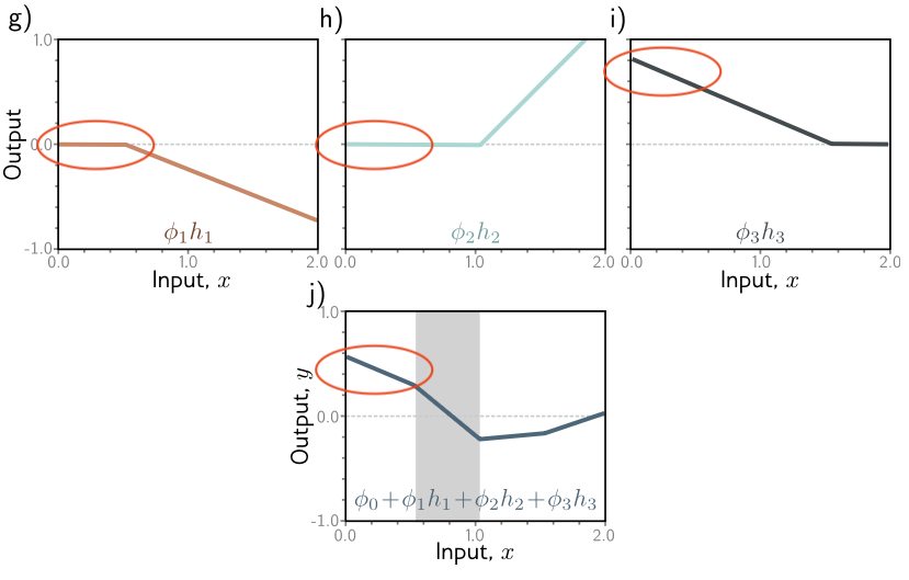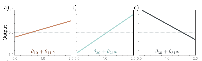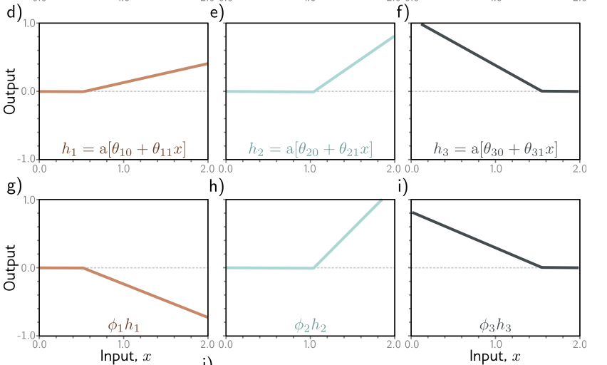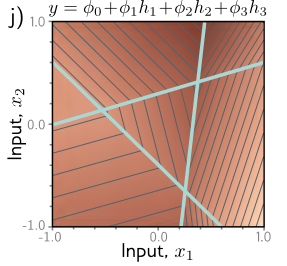 $$ y = f[x, \phi] \ = \phi_0 + \phi_1a[\theta_{10} + \theta_{11}x] + \phi_1a[\theta_{20} + \theta_{21}x] + \phi_1a[\theta_{30} + \theta_{31}x] $$