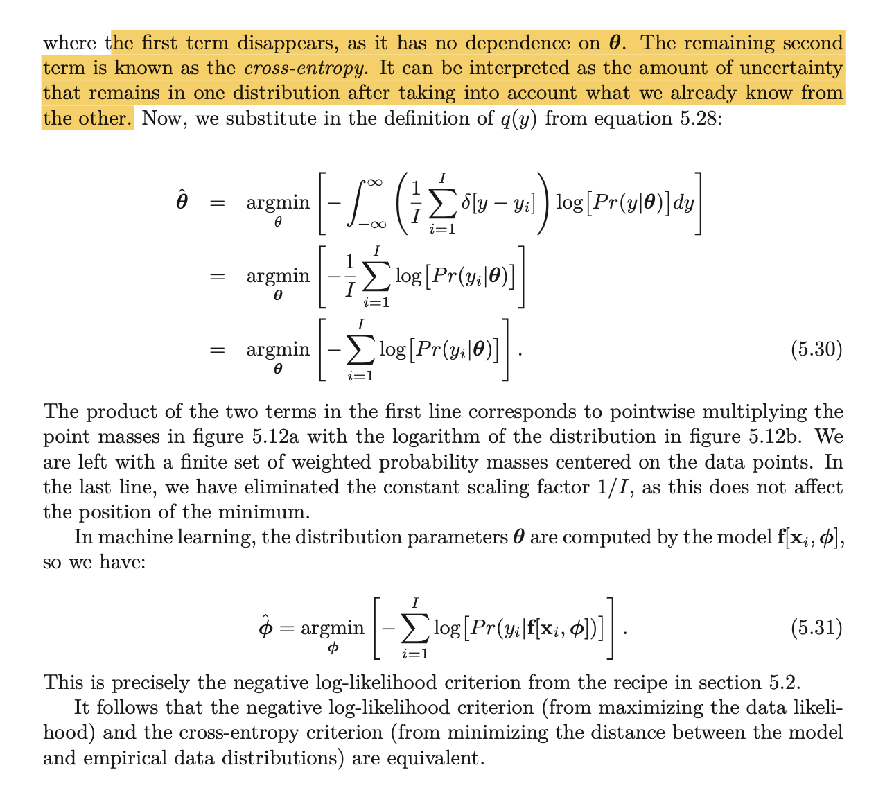 I won’t get into details here, but the gist is, you’re using KL divergence (which is a tool for finding how much one distribution differs from another) to minimize the model distribution $Pr(y|\theta)$ with the emporical distribution q(y). I am a little confused about the weighted sum of point masses part. But the results is the same. I’ll just attach the screenshots of the explanations here: