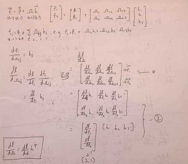 The calculation of $\frac{dl}{d\Omega}$ (bottom right) results not in $\frac{dl}{df}*h$, but in $\frac{dl}{df}*h^T$. This is the reason: